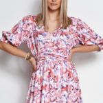 Dlouhé šaty s výstřihem a volánky na ramenou. Šaty v růžové barvě s květy a listy. Značka numoco. Vyrobeno v Polsku...