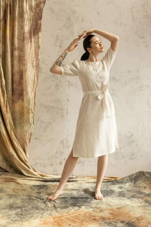 Zavinovací šaty, šaty snů pro denní nošení. Zavinovací šaty pro každodenní nošení jsou variací na klasické zavinovací šaty s mírně stahovací gumou na zádech na bocích. V kombinaci se sandály nebo elegantními podpatky se v těchto šatech snadno a s šarmem dostanete od ranní kávy až po večeři při svíčkách. Zavinovací šaty jsou doplněny látkovým páskem na míru, který zvýrazňuje ženské linie pasu. Šaty mají boční kapsy.100 % len...