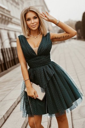Mimořádně efektní viskózové šaty s rolákem. Ve výstřihu má tato kreace decentní nášivku Numinou. Část z viskózové tkaniny je přišitá těsně k tělu a má mini délku. Od linie pasu je na vnější straně kreace tylová, napůl průhledná sukně s okouzlujícím zlatým třpytem. Šaty mají dlouhé rukávy. Je to výtvor pro zvláštní příležitosti. Proto je k dispozici pouze v tmavě černém odstínu. Šaty budou vypadat skvěle s vysokými klasickými jehlovými podpatky a společenskou kabelkou. Vezměte si je na zvláštní příležitost a užívejte si pohodlí a komfortu po celý večer...